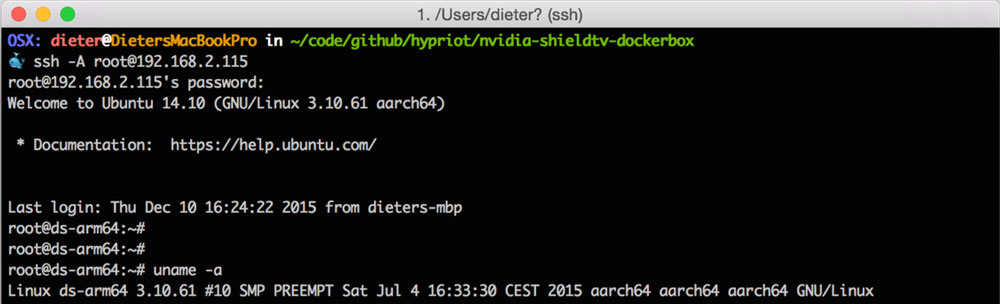 As you can see the Nvidia ShieldTV is running our new 64-bit HypriotOS system on four CPU cores and has almost three gigabyte of memory available.