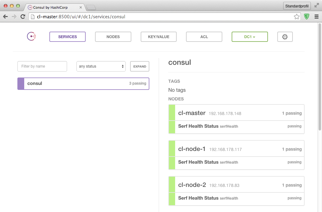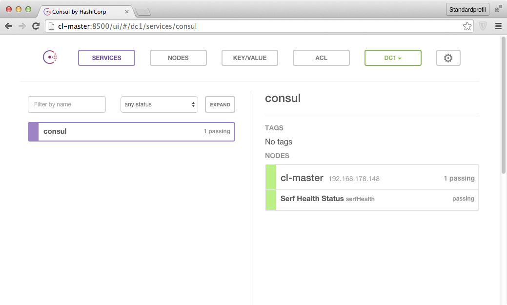 6. Use the IP (from step 5) or the hostname (from step 2) to point your browser to http://{IP or hostname of the master node}:8500. In our case http://cl-master:8500 opens the Consul web interface and our cluster master node is displayed: