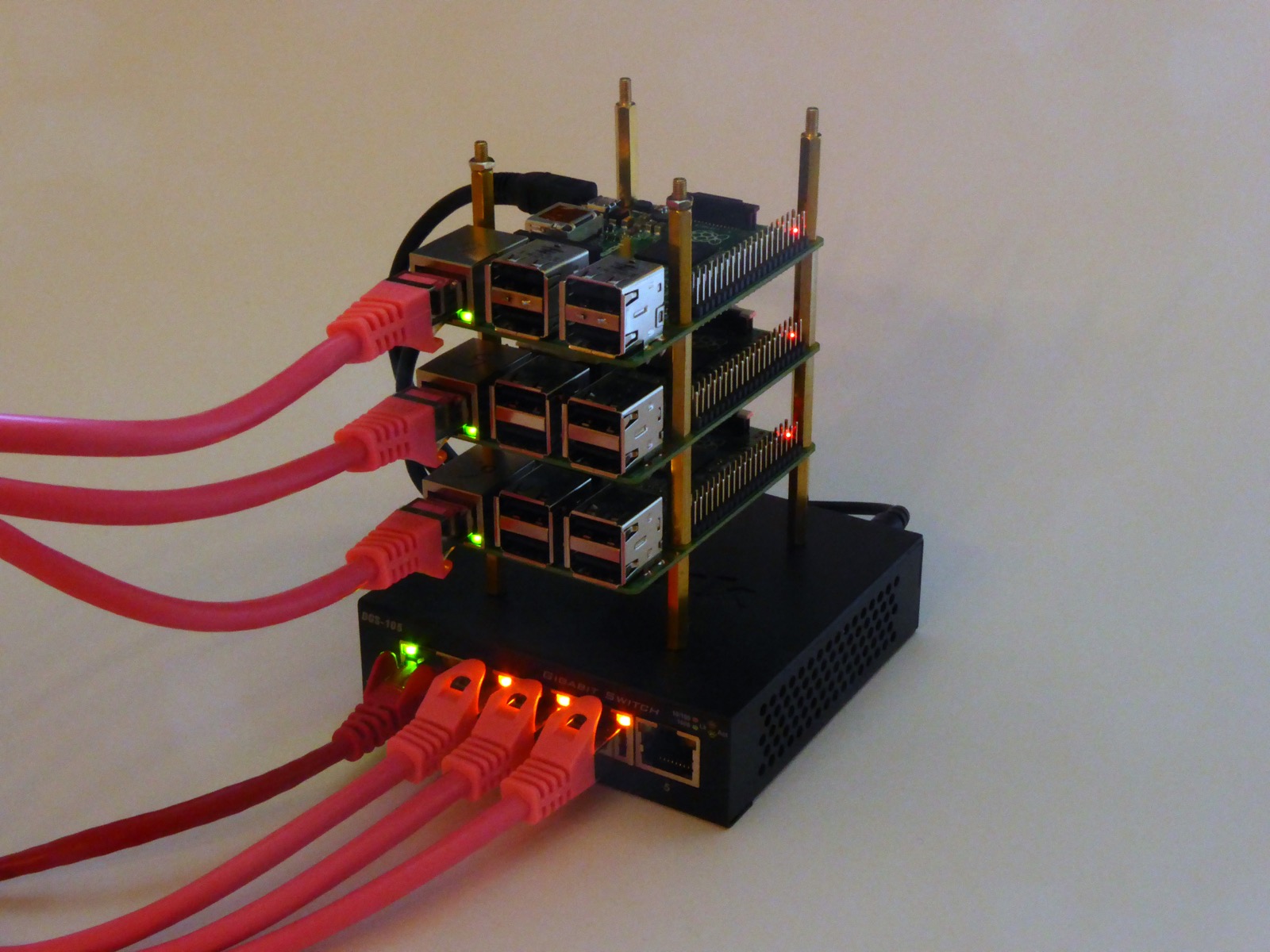 As you can see in the pictures below we have mounted the three Raspberry Pi’s on top of a 5-port D-Link GBit switch. All four devices get their power from an Anker 4-port USB charger. This makes a very solid but portable “Pi Tower” with only one power plug and one external network connector.