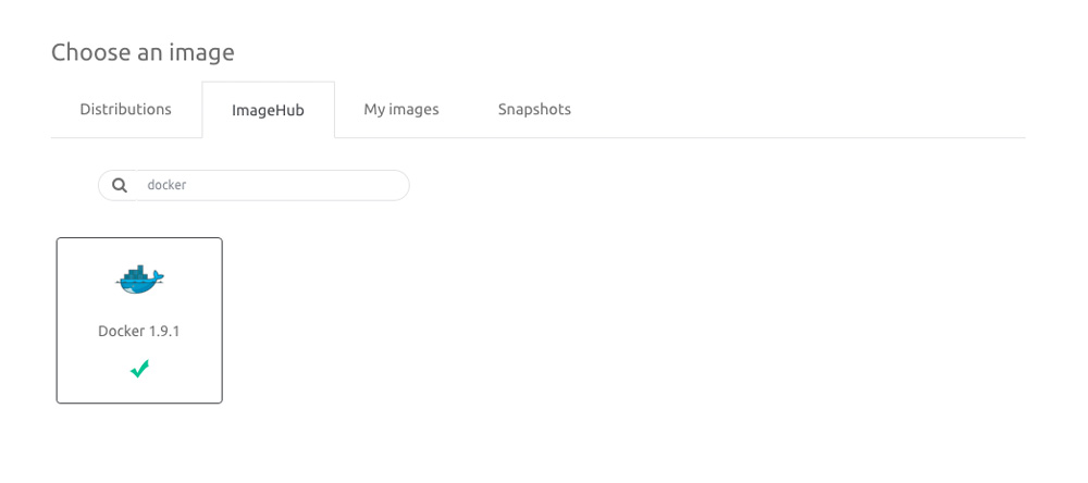 After the registration the next step is to create a new server. When creating a new server we need to choose an image. An image is the combination of an operating system and some preinstalled software. There are dozens of different images at the Scaleway ImageHub to choose from. And one is of special interest to us - the Docker image. It combines an Ubuntu 15.10 operating system with a Docker 1.9.1 installation.